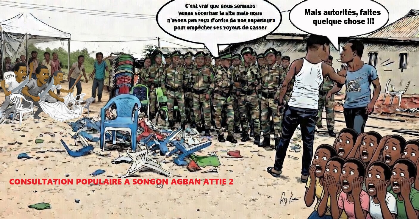 Le jour de la consultation populaire, alors que les gendarmes se trouvaient sur place, des individus, une douzaine, armés de gourdins et d’armes blanches font irruption sur le site et saccagent, après avoir dit haut et fort qu’il n’y aura jamais de consultation populaire dans ce village. Les gendarmes sont restés inertes. Interrogés, ils disent n’avoir reçu ordre de leurs supérieurs d’intervenir. Entre temps, le Sous-préfet qui tardait à venir fit appel dans ses locaux au Nanan, au nouveau chef N’CHO Jérôme Atsé et à Loba Moussan Barnabé. Seul Loba Moussan Barnabé ne se présenta pas. Le Sous-préfet expliqua qu’il n’arrivait pas à le joindre.