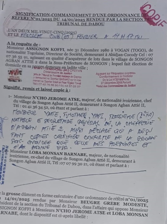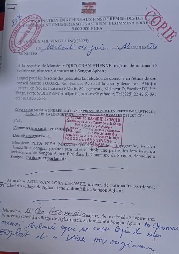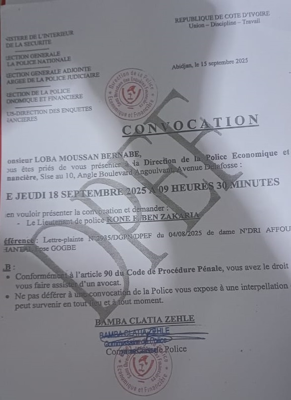 – Le 15 septembre 2025, Loba Moussan Barnabé a été assigné à la direction de la police économique et financière, par Dame N’dri Affoué Chantal epse GOGBE pour avoir été expropriée de ses lots.