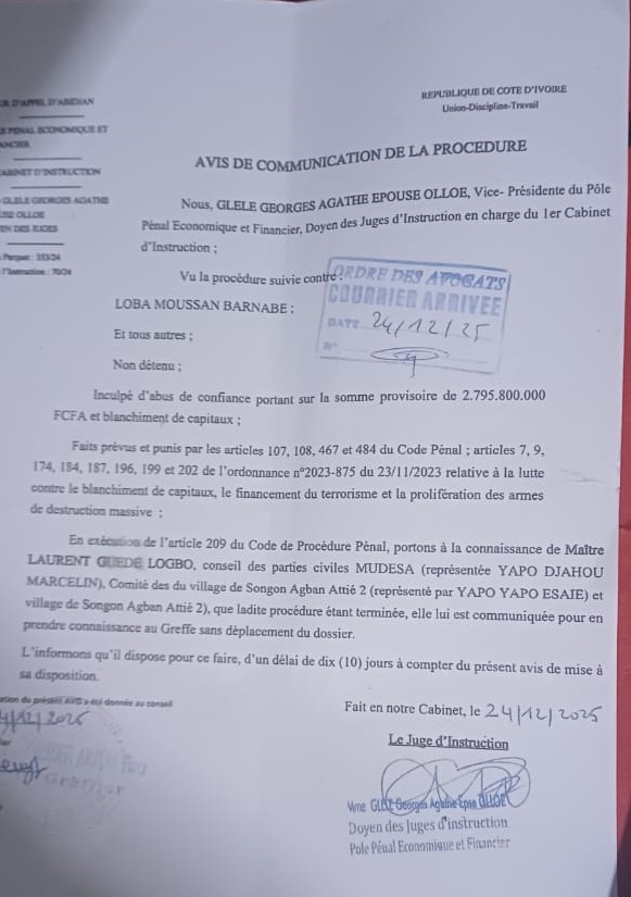 – Le 24 décembre 2025, il est inculpé d’abus de confiance portant sur la somme provisoire de 2 milliards 795 millions 800 mille Francs CFA et de blanchiment de capitaux par la Juge GBLELE GEORGES AGATHE EPOUSE OLLOE, Vice-présidente du pôle Pénal Économique et Financier, Doyen des Juges d’Instruction en charge du 1er cabinet d’Instruction.