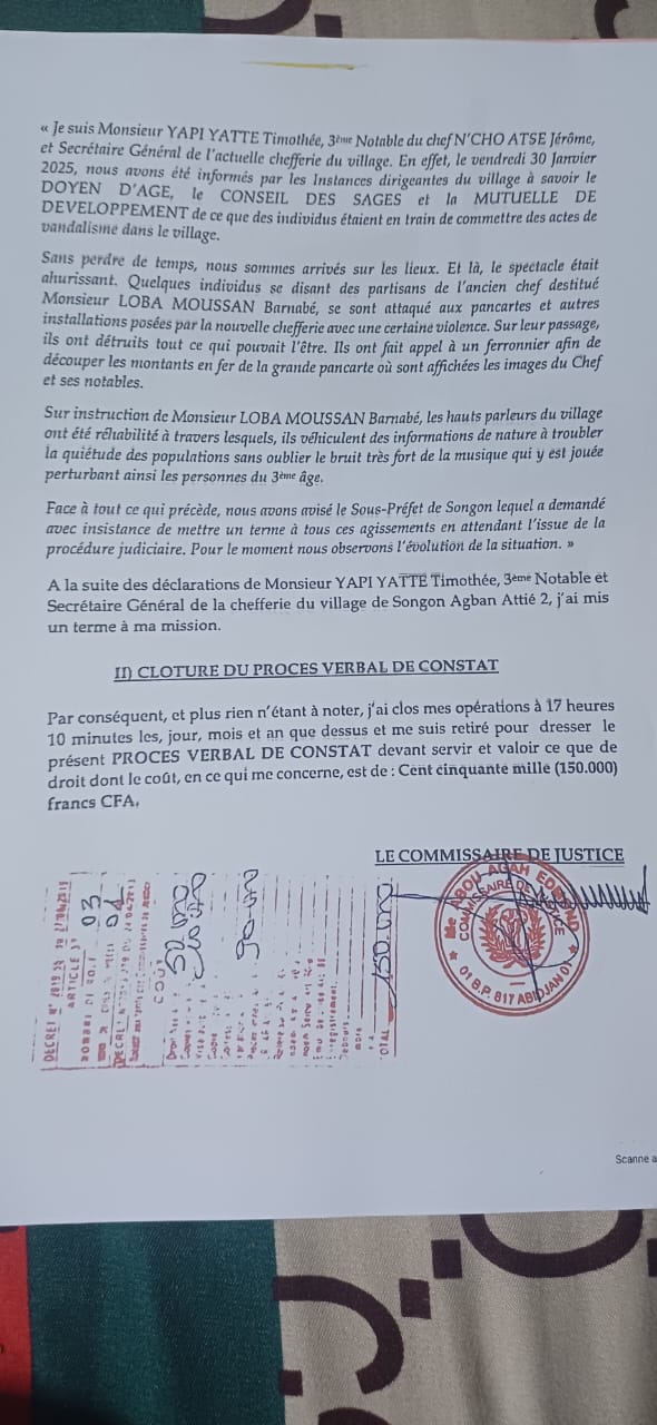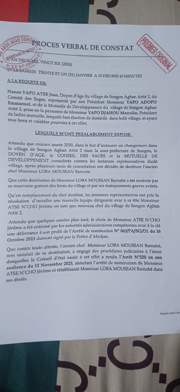 Suite à l’arrêt du Conseil d’Etat portant annulation de l’arrêté du Chef du village de Songon Agban Attié 2, l’honorable N’CHO Jérôme Atsé, capitaine des Eaux Forêts, l’ancien chef du village LOBA Moussan Barnabé, qui avait passé en son temps plus de 28 ans de règne, s’est à nouveau installé dans ses attributs de chef, au mépris de la loi et des consignes du Sous-Préfet, et sans même attendre l’issue des recours introduits auprès du Conseil d’Etat.