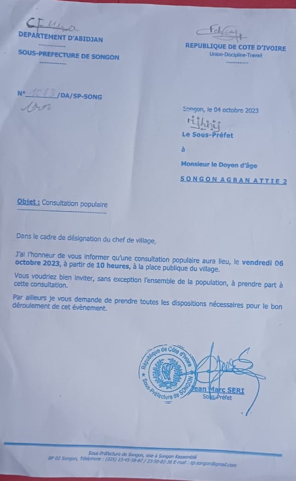 En effet, explique-t-il, le 04 octobre 2023, le Sous-préfet de Songon, Jean Marc Séri, a adressé un courrier au Nanan du village pour lui porter l’information de l’organisation, le 06 octobre 2023, d’une consultation populaire au village (voir document 0001).
